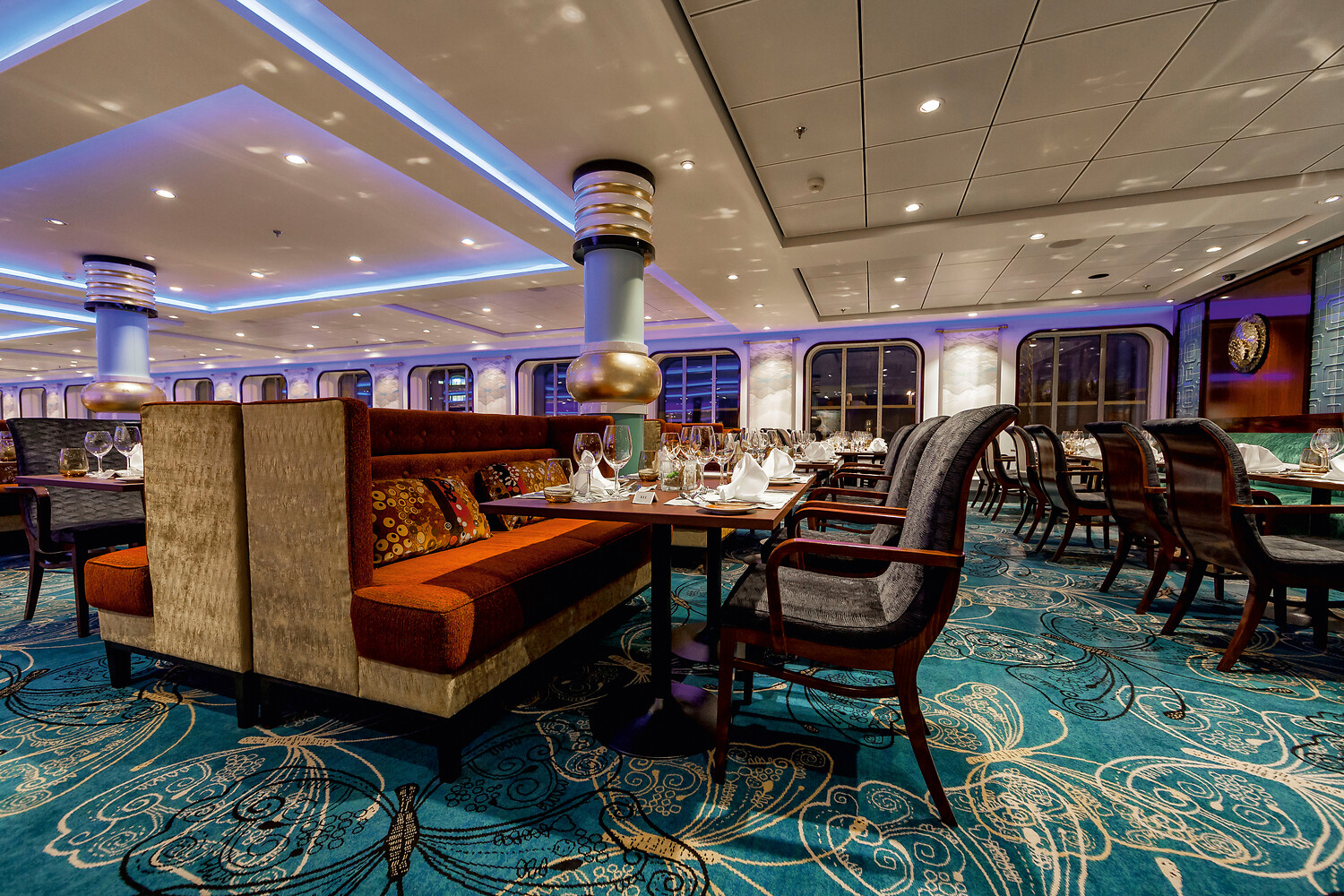 Am Heck des Schiffs begeistert die elegante Diamant Bar mit ihrer lichtdurchfluteten Atmosphäre und einem beeindruckenden Blick auf die Heckwelle. Ergänzt wird das Angebot durch den Champagner Treff im Außenbereich auf Deck 5, der ideale Ort für besondere Momente unter freiem Himmel. Jede Bar bietet ihren ganz eigenen Charme und macht die Zeit an Bord zu einem genussvollen Erlebnis.