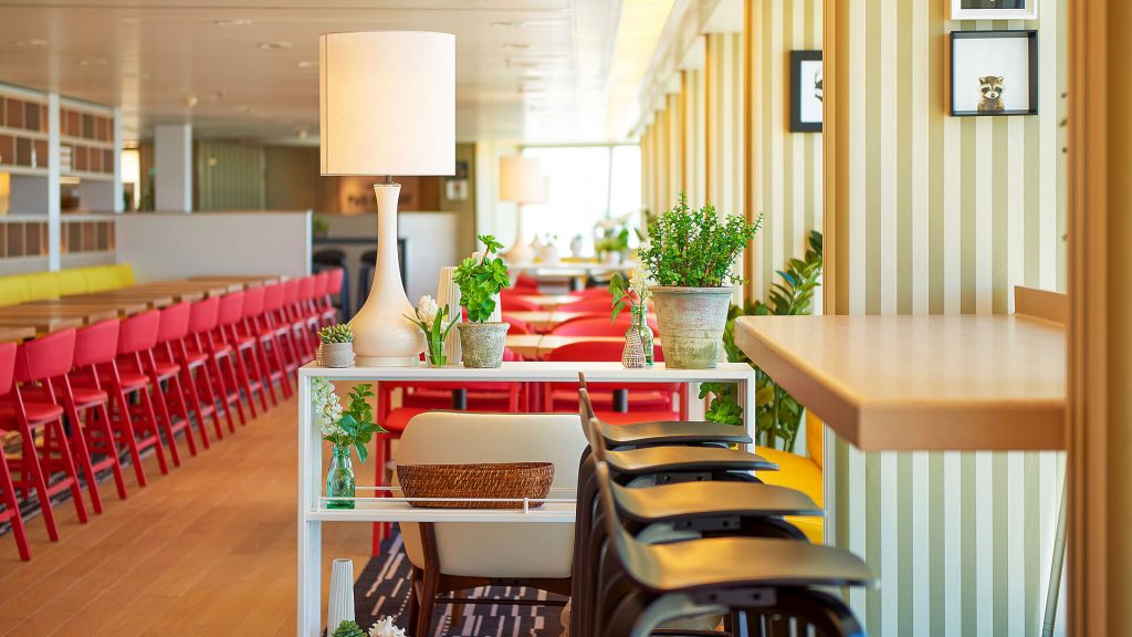Das Hauptrestaurant Waterfront auf Deck 7 ist unser persönlicher Favorit. Hier genießen Sie eine entspannte Atmosphäre mit großzügigen Fensterfronten. Angeboten werden Gerichte zu allen Tageszeiten, vom Frühstück mit stilvoller Etagere bis zum Dinner. Die Abendkarte umfasst Klassiker, täglich wechselnde Gerichte, ein veganes Menü sowie eine lokale Spezialität. Feste Tischzeiten gibt es nicht und die Platzwahl ist frei.