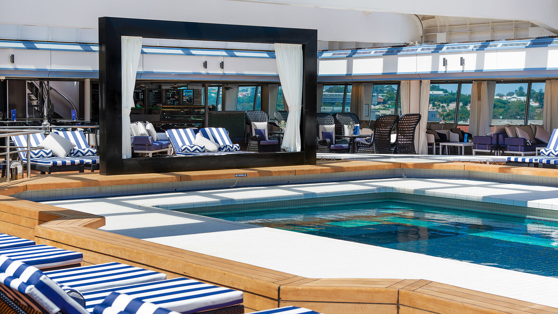 In der Schiffsmitte befindet sich eine Poollandschaft mit Klarschiebedach und vielen Sonnenliegen. Im Heckbereich erwartet Sie ein weiteres großzügiges Sonnendeck mit Pool und zahlreichen Liegen.