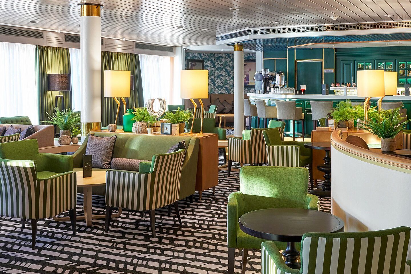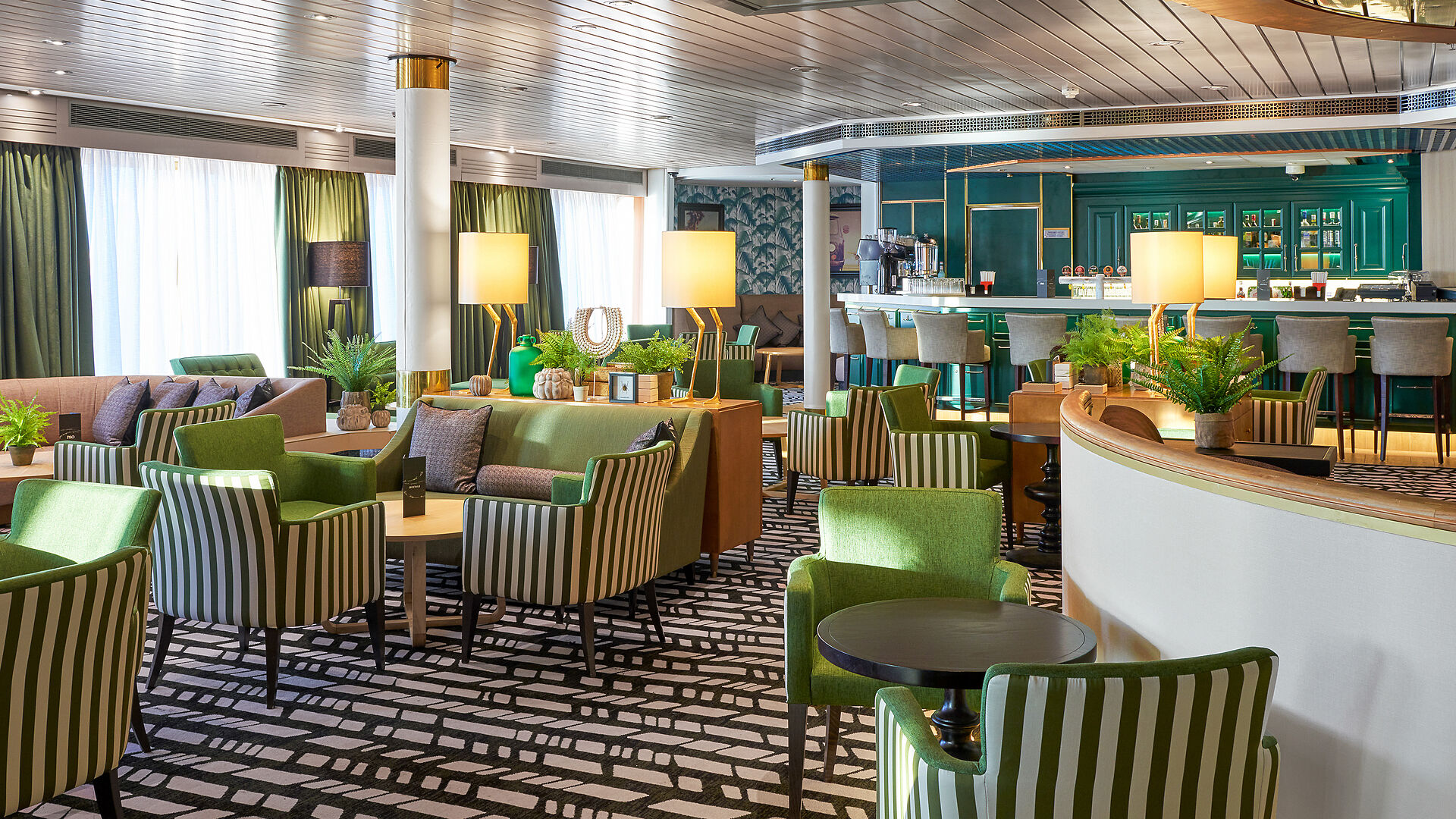 The Study ist eine ruhige Lounge zum Lesen, direkt neben der Bibliothek. Im The Dome genießen Sie tagsüber Panoramafahrten und abends Drinks in entspannter Atmosphäre.