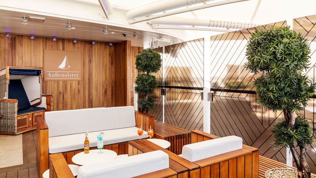 Unter freiem Himmel lädt die Außenalster Bar und Grill zu entspannten Momenten ein. Der angrenzende blaue Balkon bietet eine Extraportion Panoramablick.