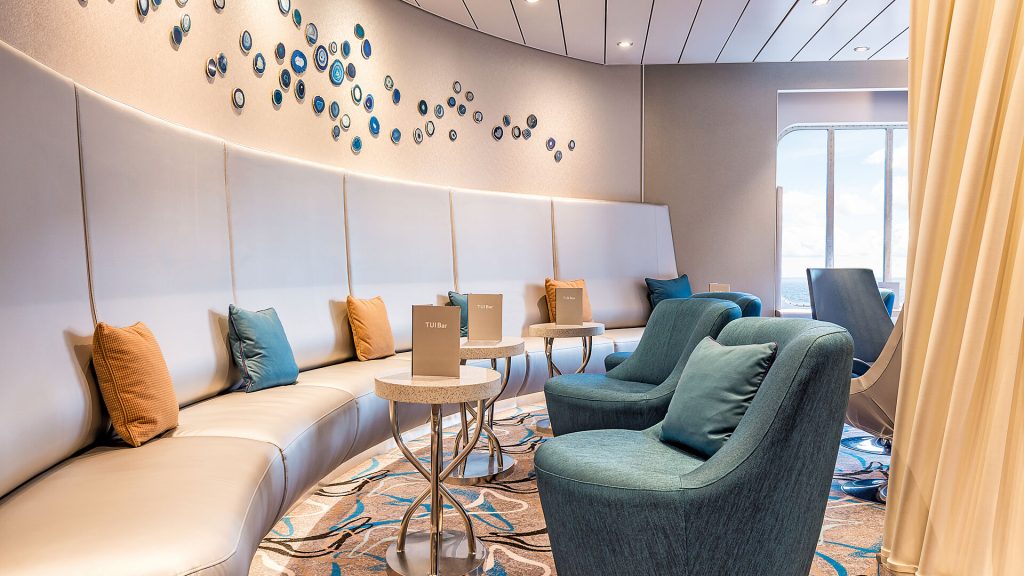 Eine der beliebtesten Bars an Bord ist die TUI Bar im Atrium. Zentral gelegen ist sie ideal für einen Cappuccino oder einen Cocktail.